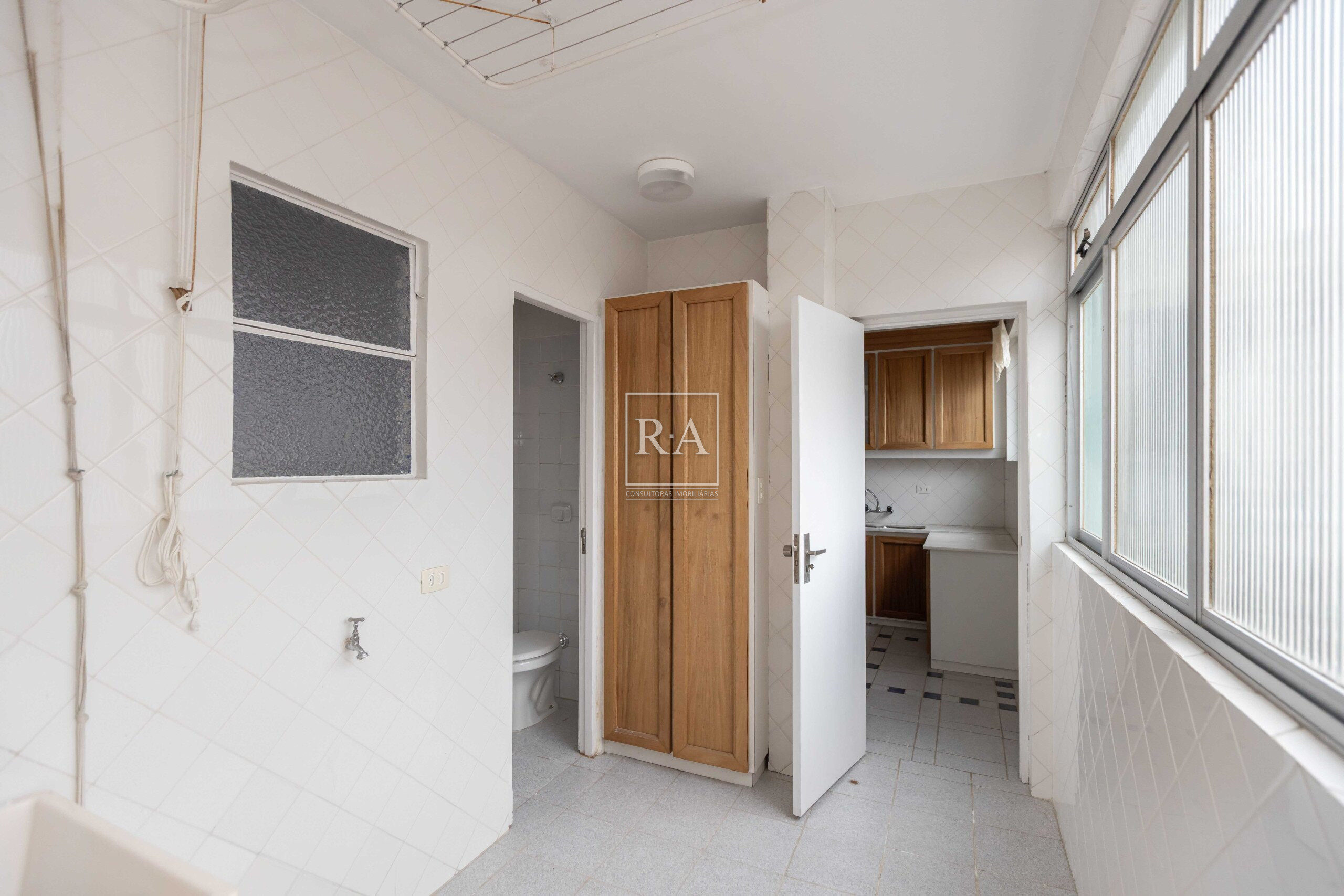 Cozinha com armários, área de serviço independente e com banheiro.