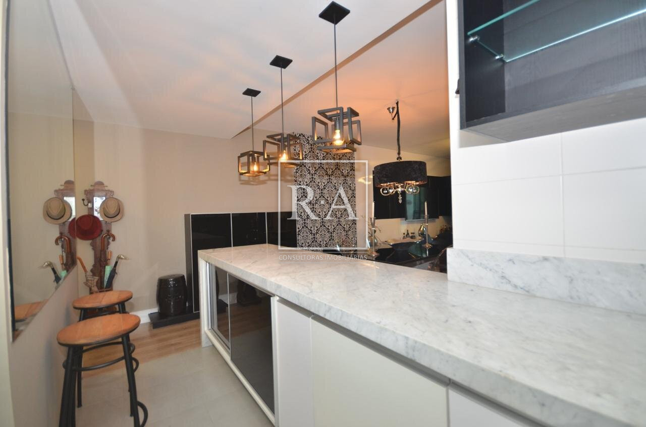 A sala integrada com a cozinha, esbanja leveza com a bancada em mármore branco Paraná, proporcionando mais aconchego e praticidade para você receber seus amigos e familiares.